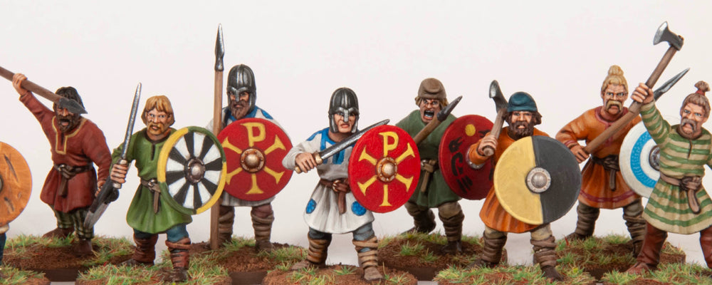 The figures can be equipped with spear, sword, ax, or seax and there are more than enough round shields for all. Our upcoming Late Roman Shields set can be used to match these as unarmored guys to go with the two Late Roman Legionaries sets.