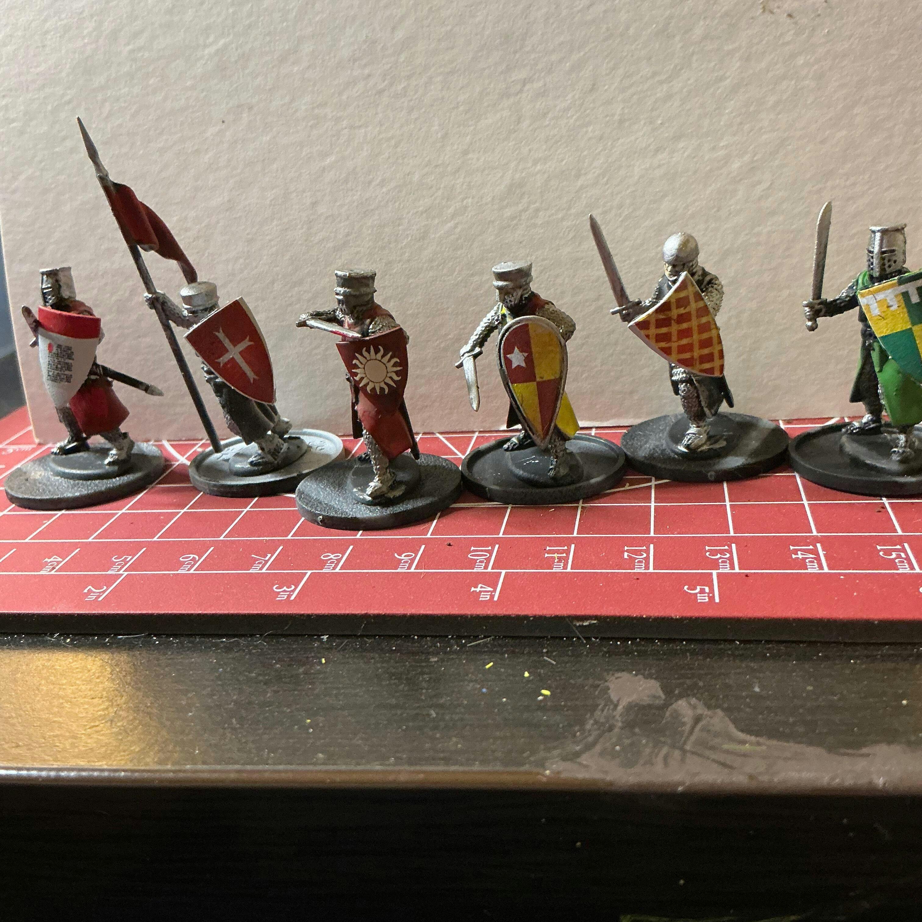 This box includes 36 shield decals with 24 unique designs and 12 battle-damaged versions. Designs based on prominent heraldry of the period including for William Marshall, Robert FitzWalter, Robert d’Vere, Guillaume II de Barres, and several others. Pre-cut designs can be affixed easily to our plastic shields.