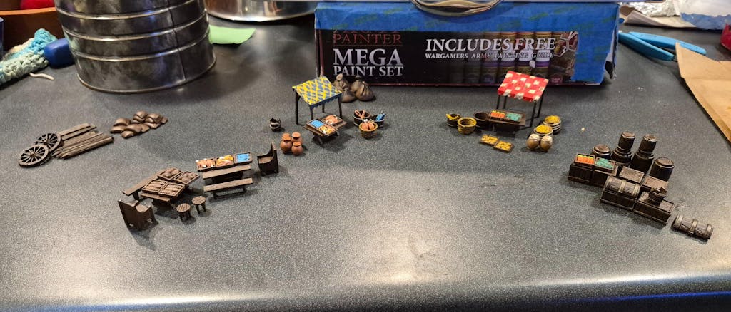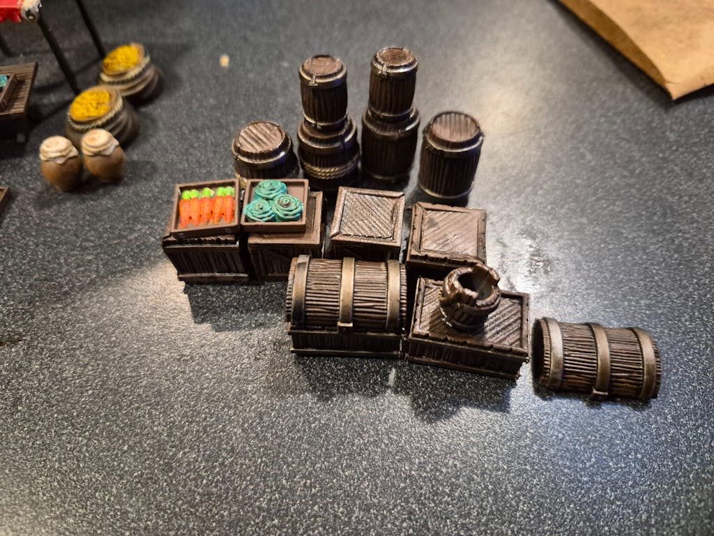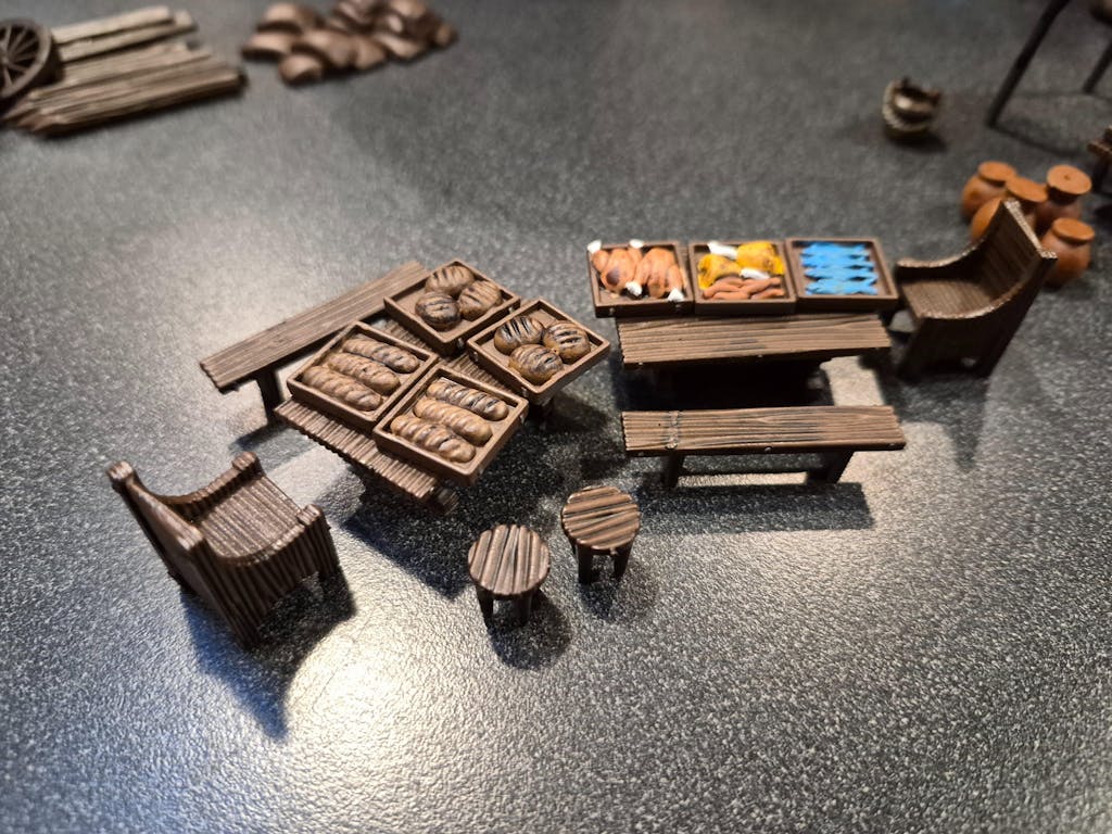 This clever (if we do say so ourselves!) hard plastic set features two unique frames that can be assembled to create up to 8 barricades. OR the same components (minus the barricade bases) can be built as a full marketplace including covered stalls, trestle tables, chairs, chests, buckets, baskets, barrels, sacks, pots, crates, and a variety of food stuffs!