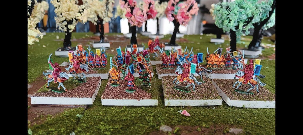This hard plastic box set allows you to field up to 192 10mm infantry and 32 cavalry equipped with yari (spear/pike), naginata (pole arm), yumi (longbow), and katana (sword). You can see the mix of one, two, three, and five man strips on the back of the box with the variety of weapons. There are also 12 casualty figures included to use for scenic basing or as markers.