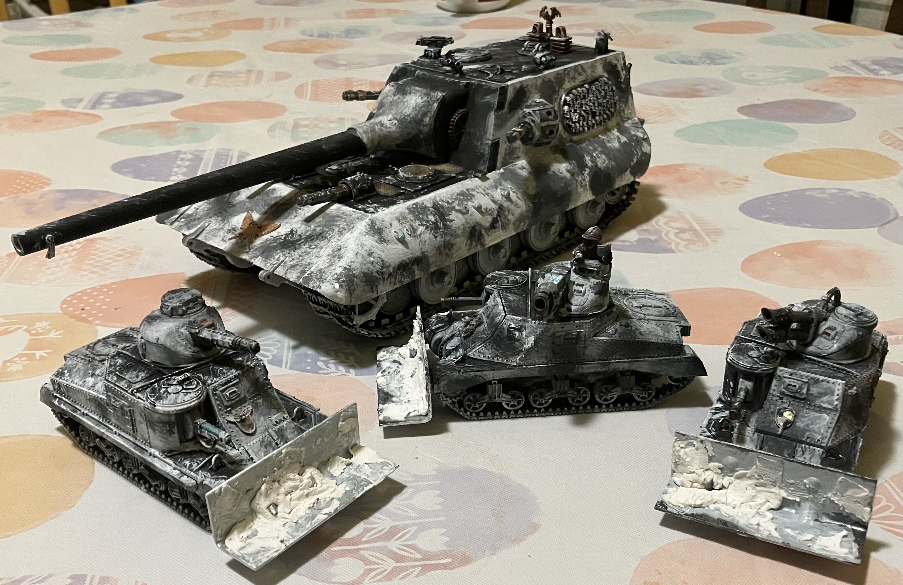 I know this is a pretty old thread, but since it's relevant I thought I'd share! This is a platoon of snowy tanks for my grognards/cannon fodder mixed army. they're a 1/35th e-100 stug model, with three m3 lees from bolt action. the dozer blades in front are corner brackets with some texture. most of the guns come from the wga heavy weapons teams. all in all not too hard to convert and decently cheap, though the main turrets for the smaller tank were a pain in the neck to fit. also please ignore the easter tablecloth, it's been a long winter.