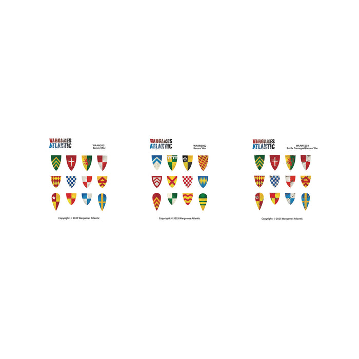 This box includes 36 shield decals with 24 unique designs and 12 battle-damaged versions. Designs based on prominent heraldry of the period including for William Marshall, Robert FitzWalter, Robert d’Vere, Guillaume II de Barres, and several others. Pre-cut designs can be affixed easily to our plastic shields.