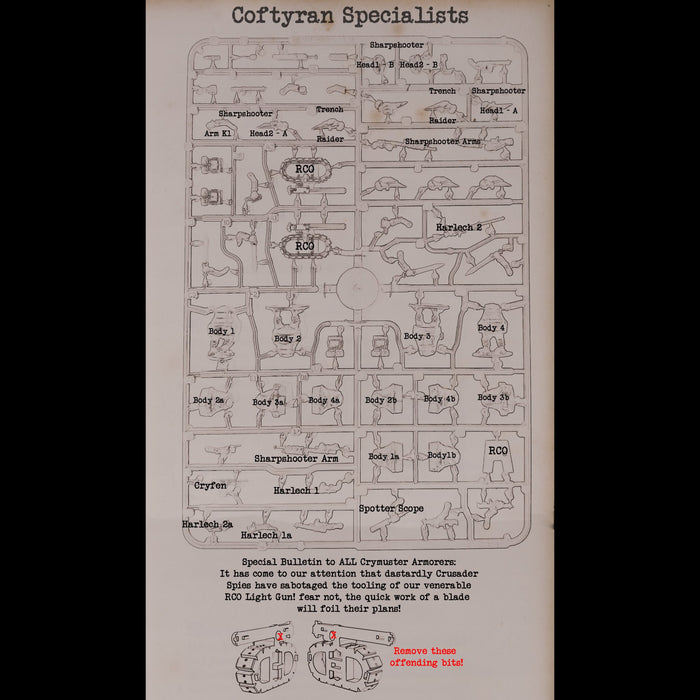 This hard-plastic box set includes enough parts to build 12 Coftyran Specialists, with options for trench raiders, sharpshooters, and RCO field gunners, along with 12 Wargames Atlantic Dual-Use 25mm Bases.