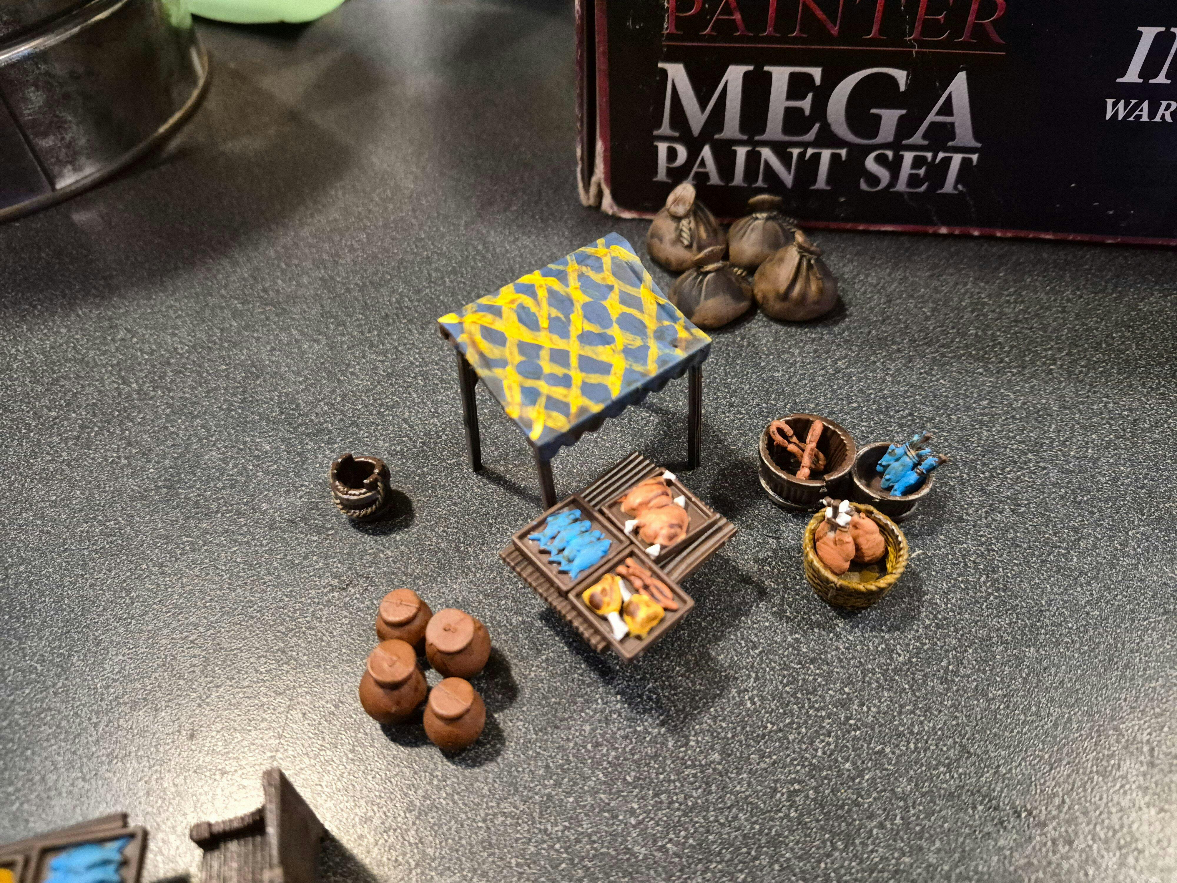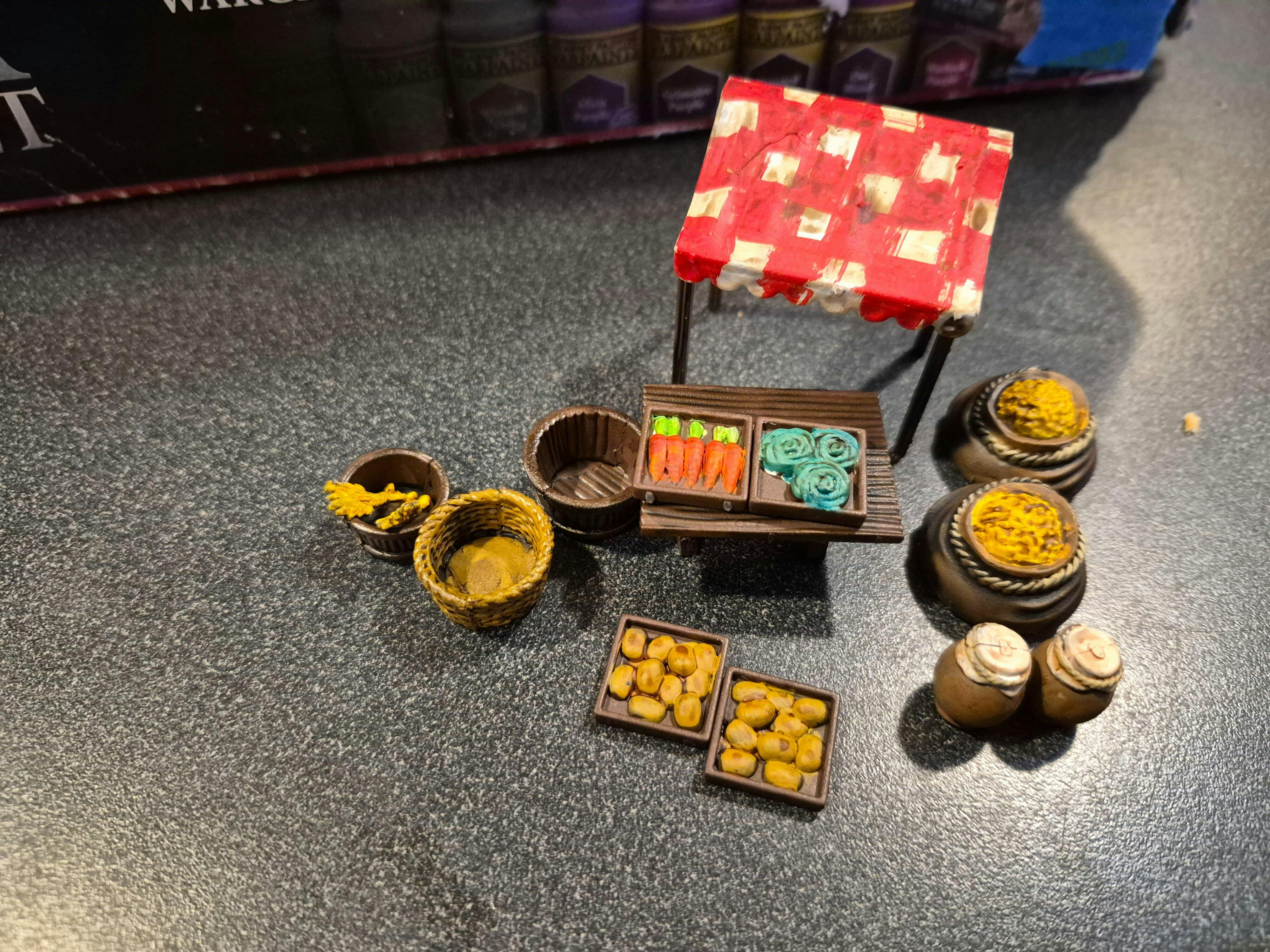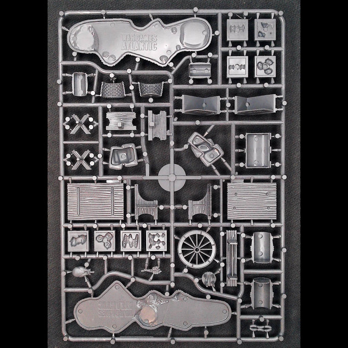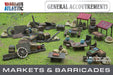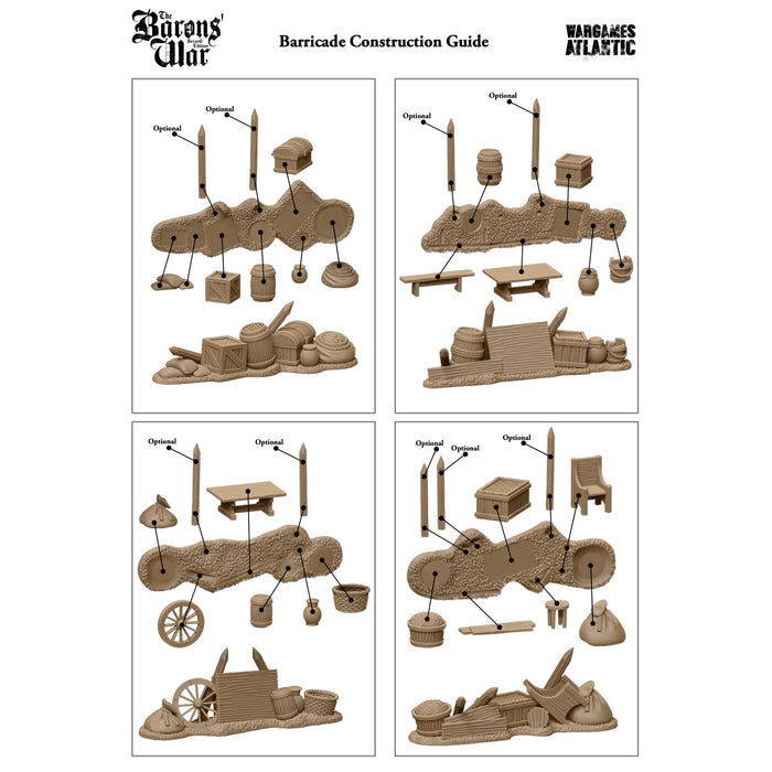 This clever (if we do say so ourselves!) hard plastic set features two unique frames that can be assembled to create 8 barricades. OR the same components (minus the barricade bases) can be built as a full marketplace including covered stalls, trestle tables, chairs, chests, buckets, baskets, barrels, sacks, pots, crates, and a variety of food stuffs!