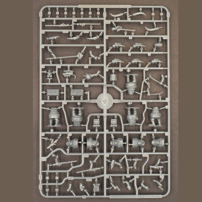 This plastic box set includes enough parts to build a complete Coftyran Command Team, including Officers, Standard Bearers, Musicians, and various support specialists, providing everything needed to lead a Coftyran force in defense of the homeland!